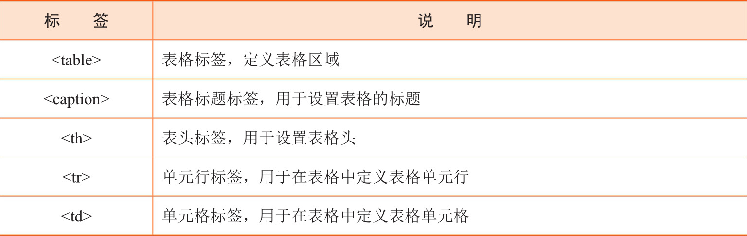 在HTML中表格标签是开发人员常用的标签,尤其是在Div+CSS布局还没有兴起的时候,表格是网页布局的主要方法。表格的标签是<table></table>,在表格中可以放入任何元素,常用的表格标签说明如表2-4所示。