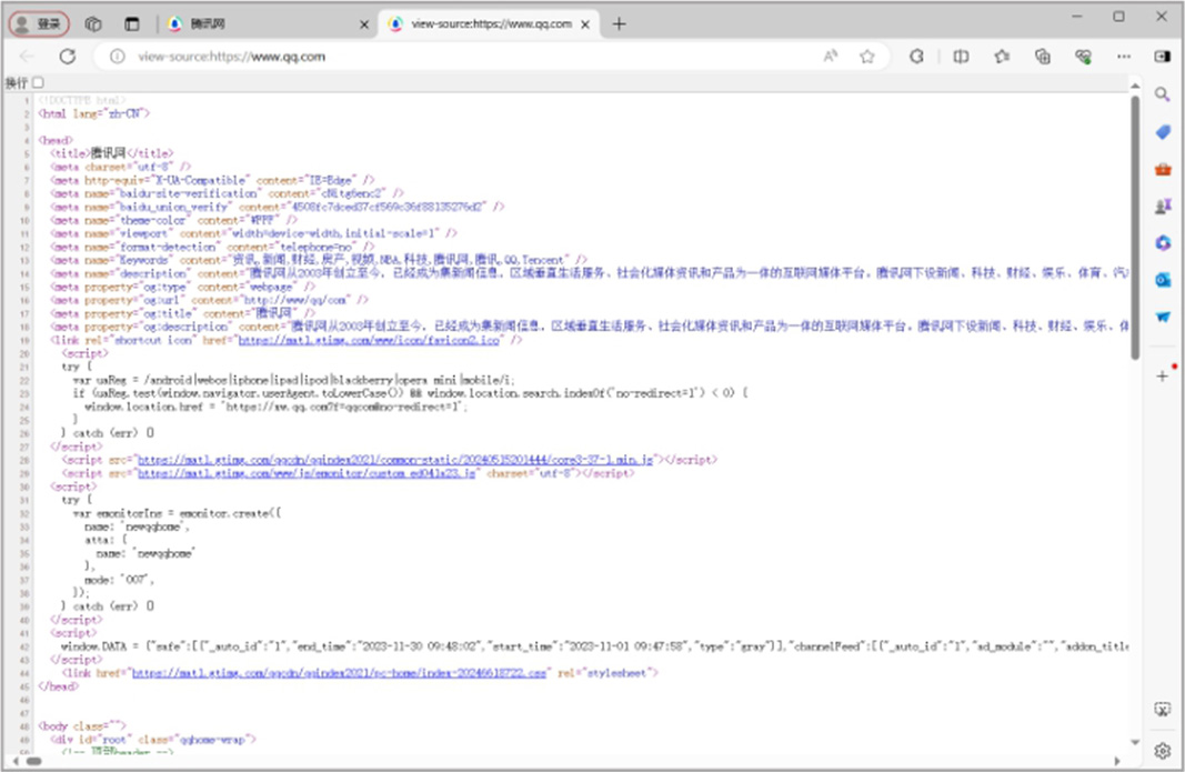 在浏览器的地址栏中输入 www.qq.com 就可以进入“腾讯”网站主页,如图1-1所示。在网页上右击,在弹出的快捷菜单中选择“查看页面源代码”命令,可以在新打开的浏览器选项卡窗口中看到网页的HTML代码内容,如图1-2所示。