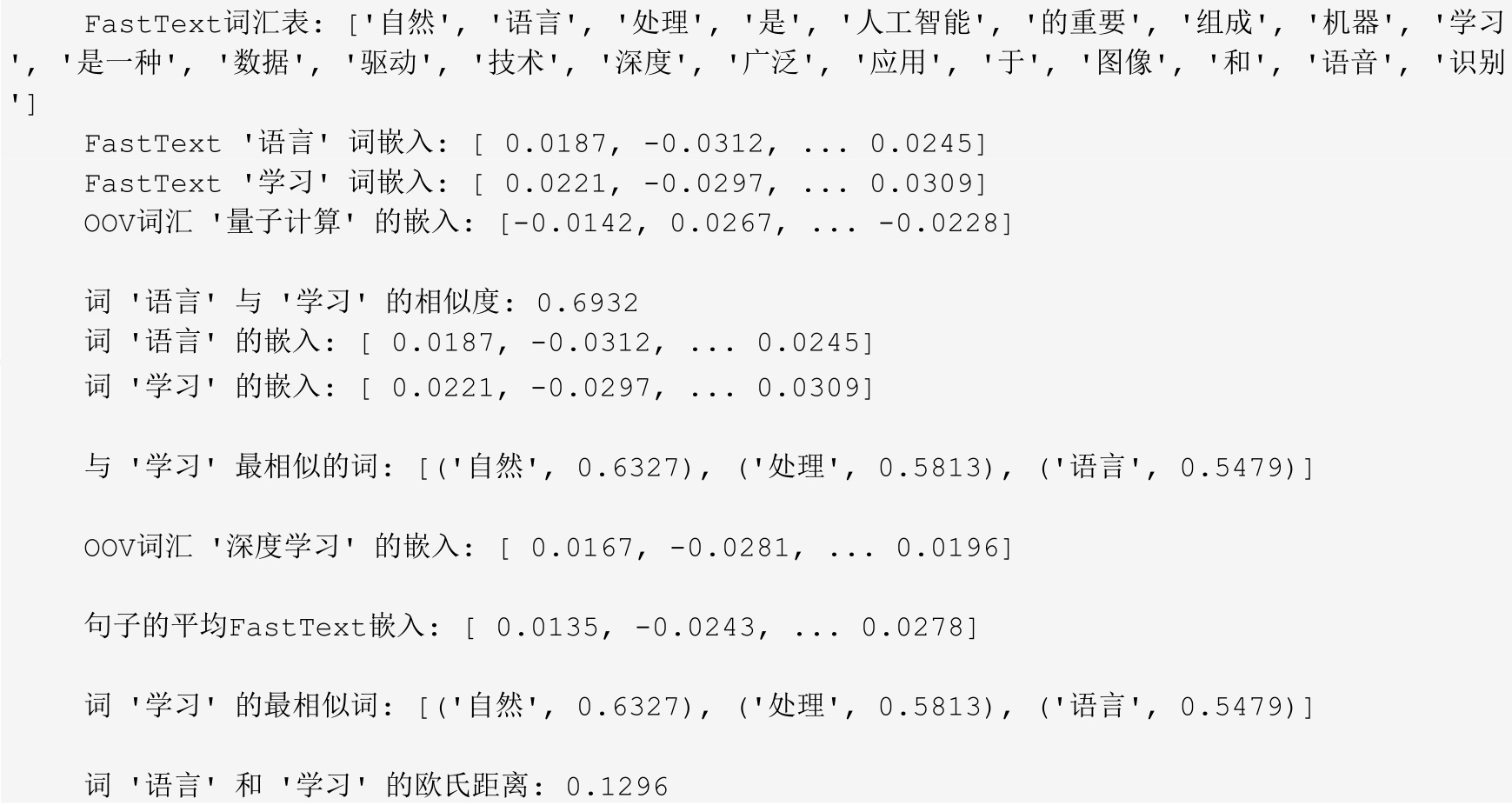 此结果展示了FastText在捕捉细粒度语义信息中的优势。通过字符n-gram,FastText能够有效生成OOV词汇的嵌入表示,从而增强对新词和未登录词的处理能力,并通过相似性计算展示词汇间的语义关系。