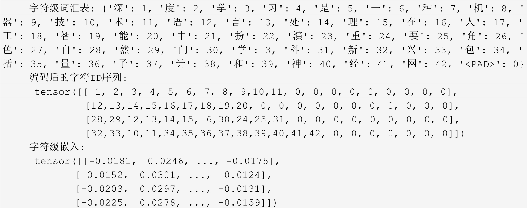 (3)encode_sentence函数将句子中的每个字符转换为对应ID,并对不足的部分进行填充,使得每个句子长度一致。