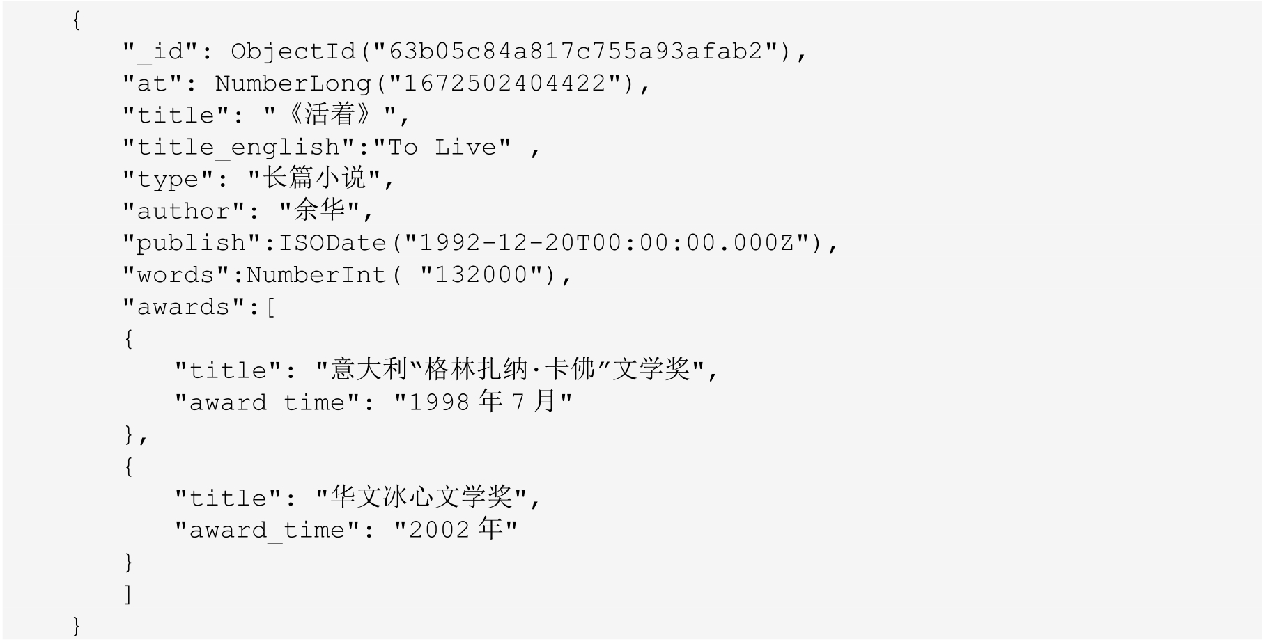其中_id是一个12字节的十六进制数字,可确保每个文档的唯一性,其结构如上述Object ID的组成所述。publish是一个标准化日期类型,类型名称为ISODate。at是一个长整型数字类型,类型名称为NumberLong。words是一个整型数字类型,类型名称为NumberInt。其余字段为字符串类型,类型名称为String(可省略)。