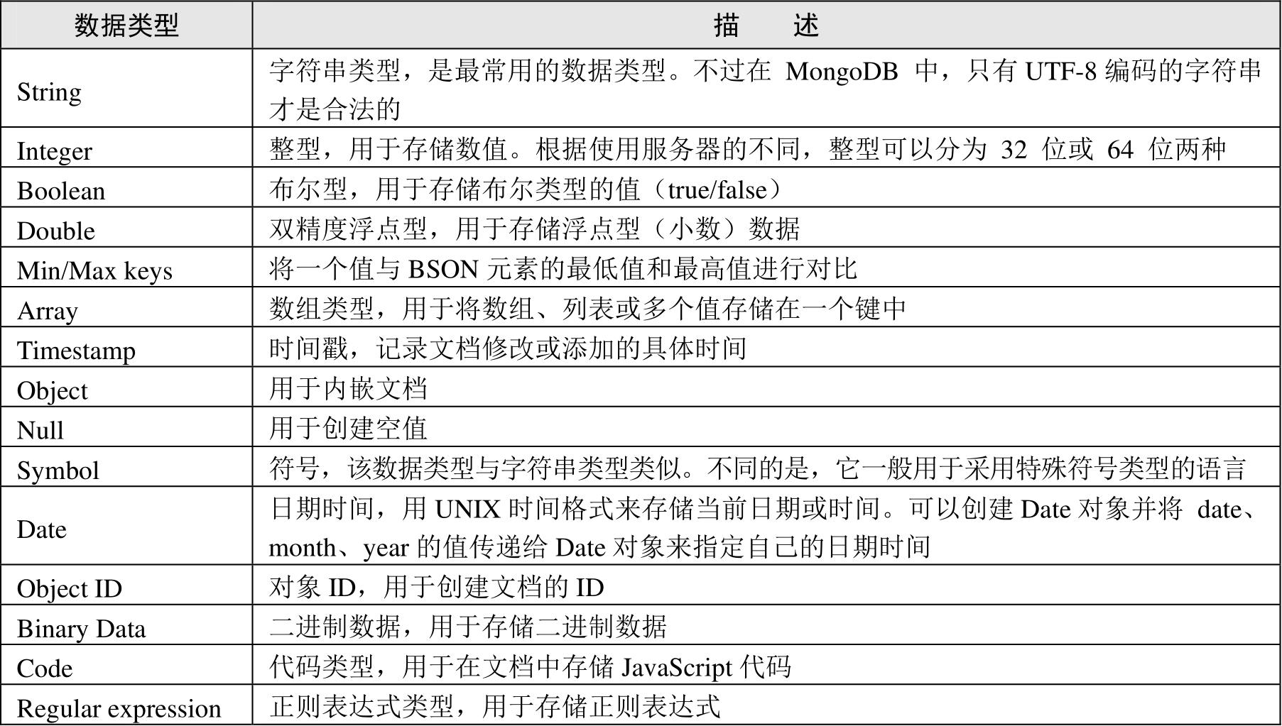 表1.5 MongoDB中常见的数据类型