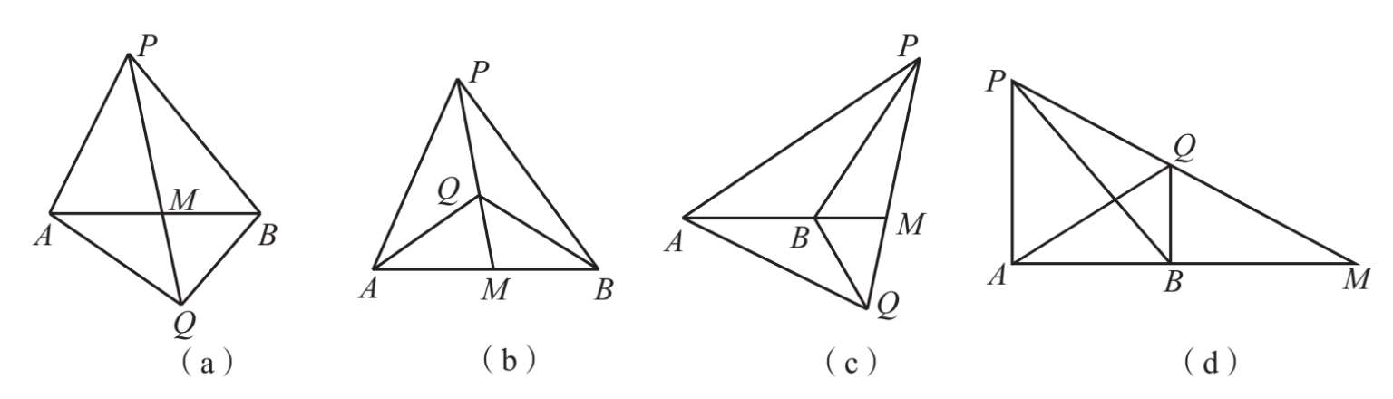 若直线 PQ 和 AB 交于点 M (见图2,有4种情形),则