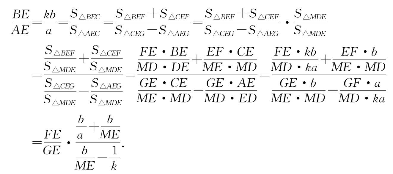 的位置,本是一件不容易的事,它相当于解二元一次联立方程组.而共边定理却用两个三角形的面积比简单地表示出