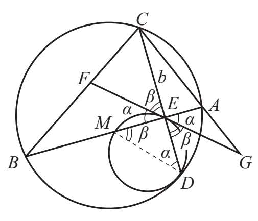 如图3,设圆 P 外接于锐角△ ABC ,且 AB ≠ AC , CE ⊥ AB ,交 AB 于 E ,交圆 P 于 D ,过 D 、 E 及边 BA 的中点 M 作圆,再过 E 做此圆的切线分别交直线 BC 、 AC 于点 F 、 G .求证: EF = GE .