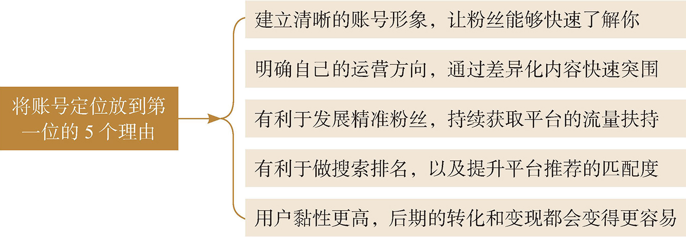 做好全媒体的运营定位,运营者需要在准备注册账号时,将账号定位放到第一位。只有把账号定位做好了,之后的运营道路才会走得更加顺畅。图1-2所示为将账号定位放到第一位的5个理由。