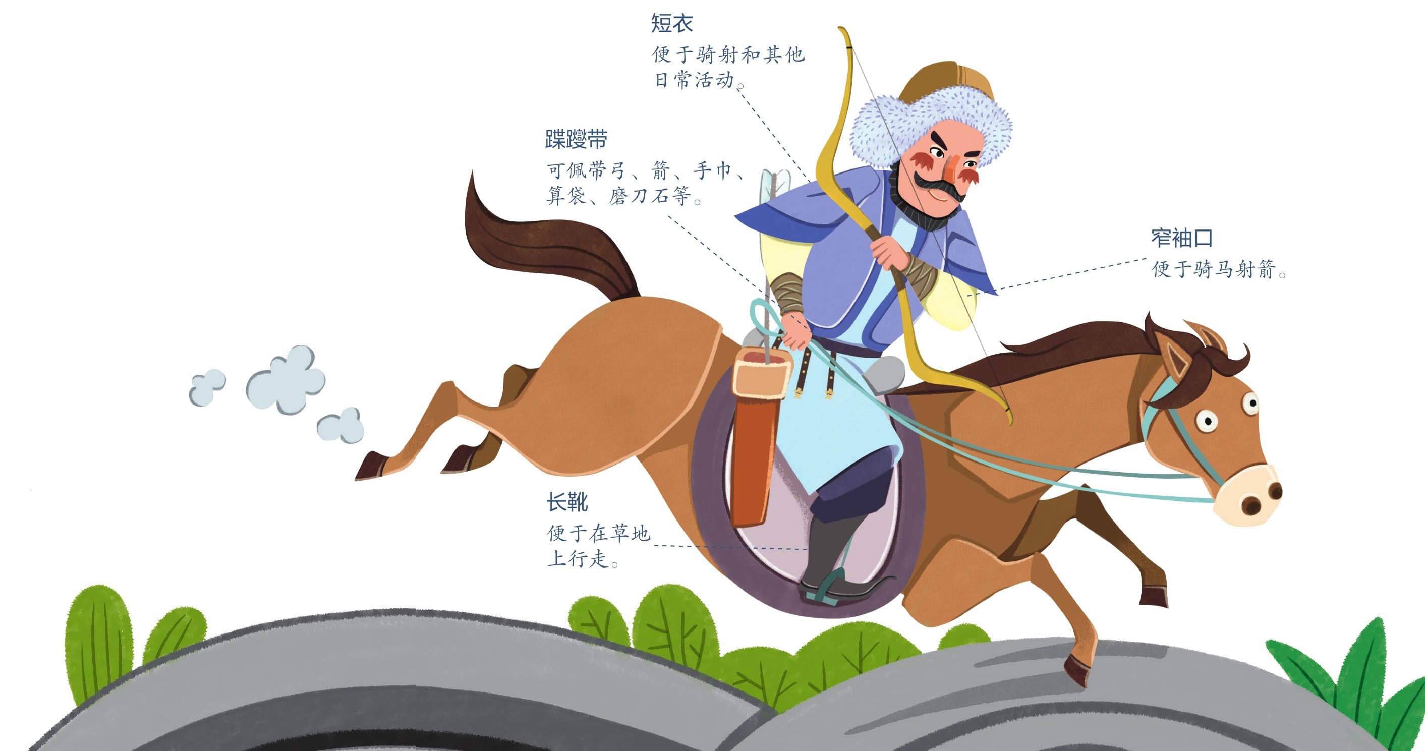 中国衣冠,自北齐以来,乃全用胡服。窄袖、 绯 绿短衣、长 靿 靴、有 蹀 躞 带,皆胡服也。窄袖利于驰射,短衣、长靿,皆便于涉草。胡人乐茂草,常寝处其间,予使北时皆见之。虽王庭亦在深荐中。予至胡庭日,新雨过,涉草,衣裤皆濡,唯胡人都无所沾。带衣所垂蹀躞,盖欲佩带弓剑、 帉 帨 、算囊、刀 砺 之类。自后虽去蹀躞,而犹存其环,环所以衔蹀躞,如马之 鞦 根,即今之带 銙 也。天子必以十三环为节,唐武德、正观时犹尔。开元之后,虽仍旧俗,而稍褒博矣,然带钩尚穿带本为孔。本朝加顺折,茂人文也。