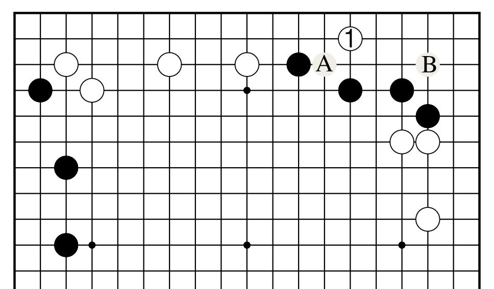 白1是打入的急所,其后白棋A位或B位必居其一。