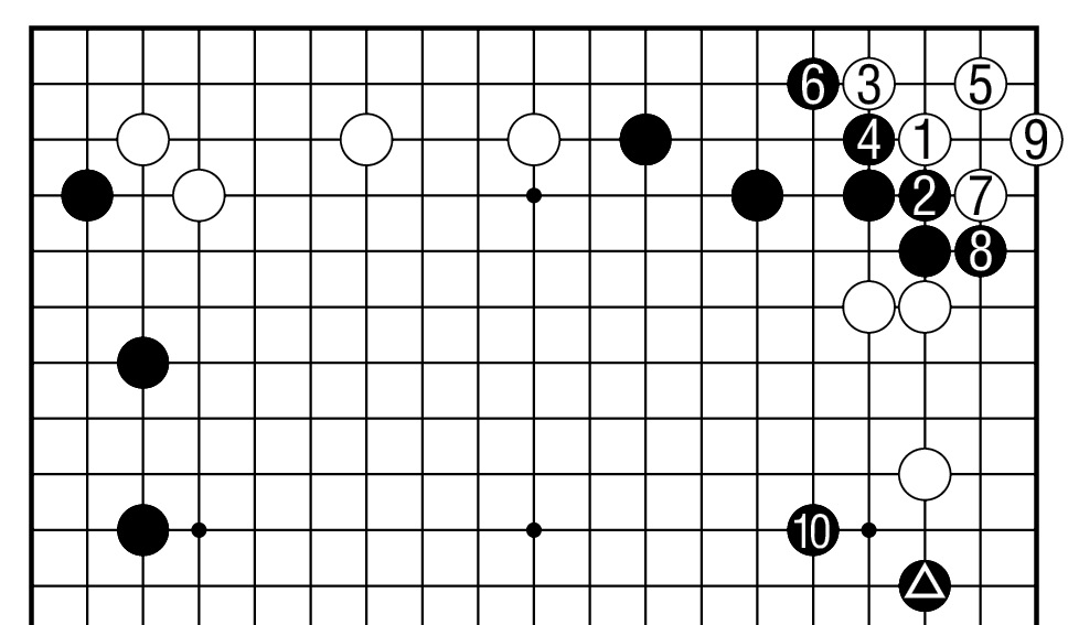 位有子,黑2团很好,以下至白9,白棋虽可活角,但黑10攻击,黑棋充分。