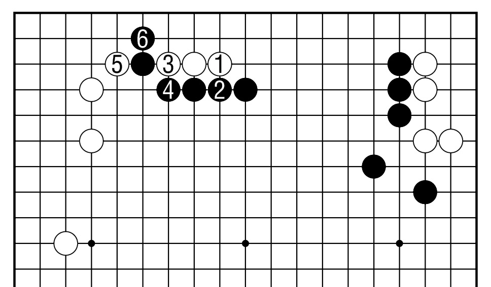 续图5,其后黑1接,白2时,黑3断,白4虎,此时黑5下立是缓手,白6守角,白棋满足。