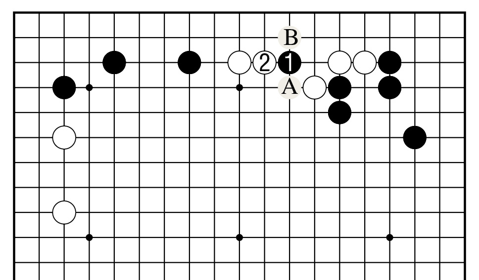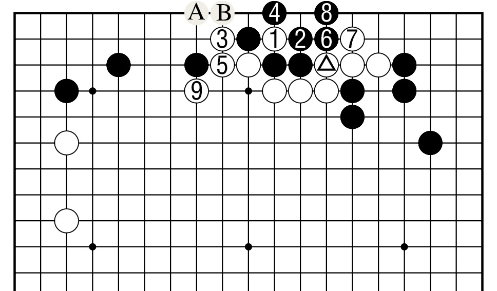黑1时,白2顶的下法也有可能,以后黑A时,白B扳,结果与图8同。