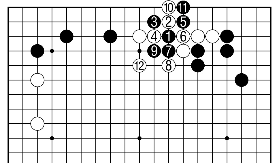 黑1打入时,白2托是最顽强的抵抗,黑3扳,白4断,黑5打吃,白6反打,以下至白12,白棋封锁是好次序。