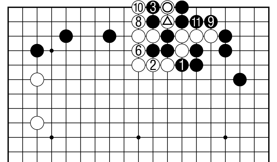 续图7,黑1只好断,白2打吃,以下至黑11,白棋利用弃子先手整理外围,其好坏将由周边棋子的布置决定。