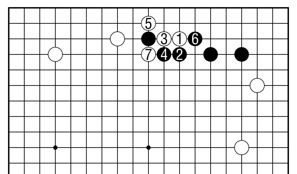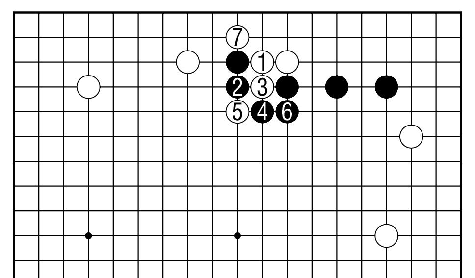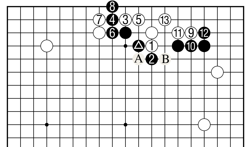 时,白1长、3托是次序,黑4、6时,白7先手与黑8交换后,白9点是要领,以下进行至白13,白棋做活,而且还可瞄着黑棋A位和B位的弱点。