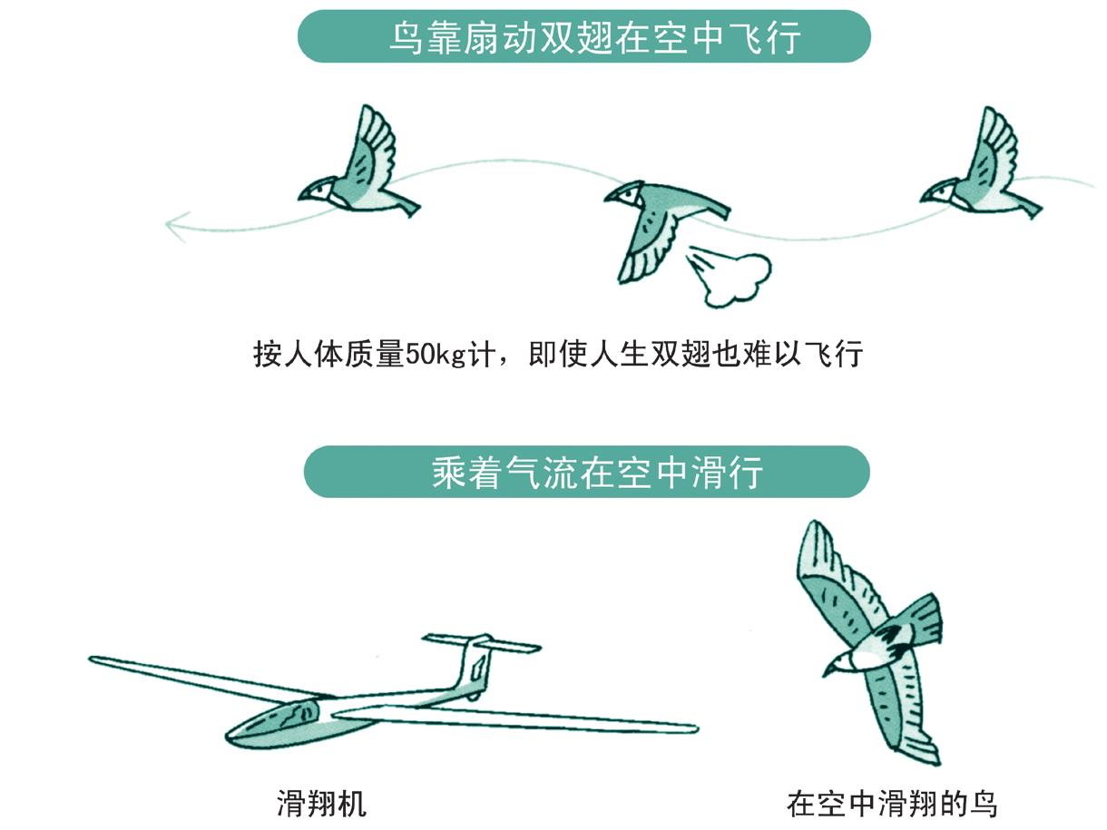 许多鸟和昆虫靠翅膀获得前进的力(推力)和浮力(升力),从而能在空中自由自在地飞行。从前,梦想在空中自由飞翔的冒险家曾经做出过酷似鸟翼的机构,但试飞都以失败告终。人们得出的结论是“制作像翅膀那样的,能支持超过50kg人体体重的翼是不可能的。”(随着材料和控制技术的发展,扑翼无人机已经研制成功。)鸟经历长期的进化过程,不仅形成巧妙的翼,而且具有得天独厚的身体:结实而中空的骨骼、强有力的肌肉,使它能高效率动作,既轻盈又强韧。但即使像白天鹅这种大型鸟类,其体重也不过10kg左右。