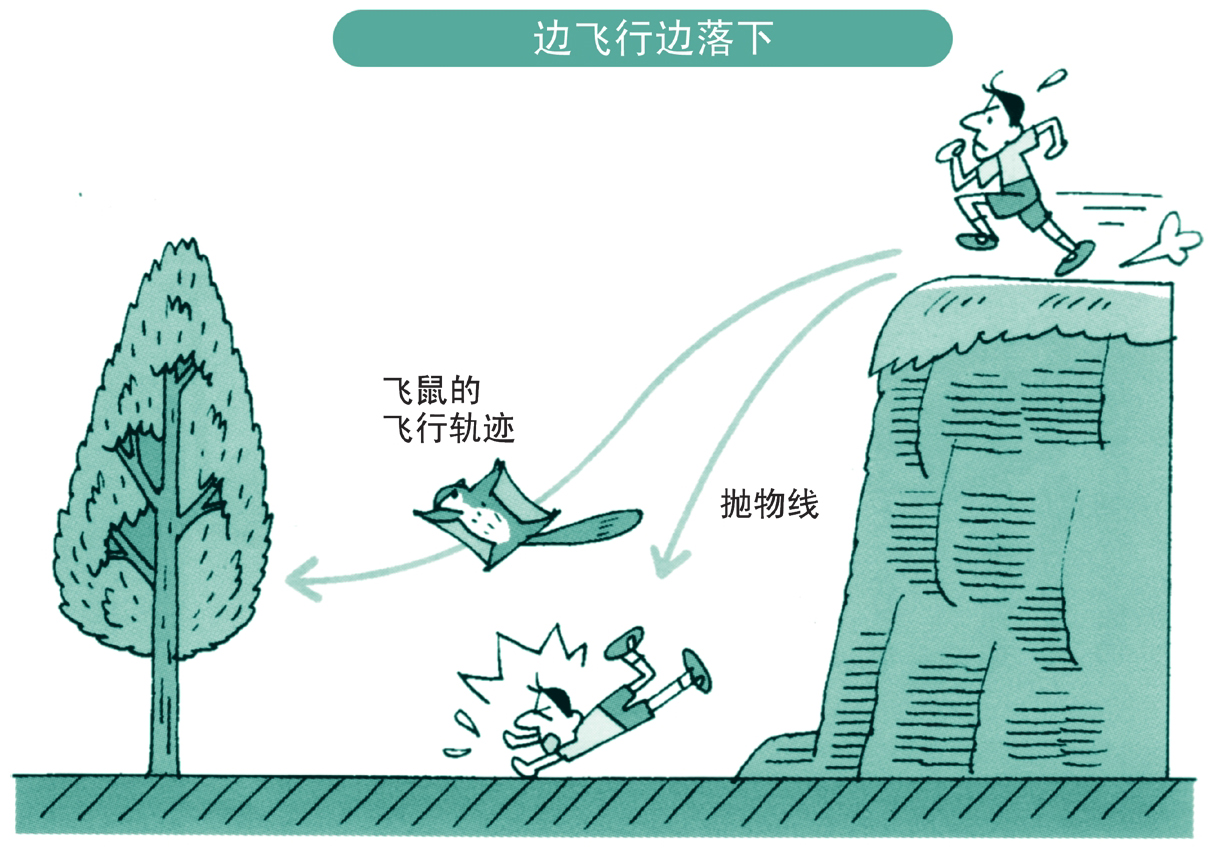 只要能在空中飞行,即使不配置特殊的道具,也能安全地从高高的悬崖上飞降而下。若经过助跑的飞落过程还能实现水平方向的移动,此时的轨迹便是抛物线。实际上,由于受空气阻力的作用,其轨迹与抛物线会略有差异。