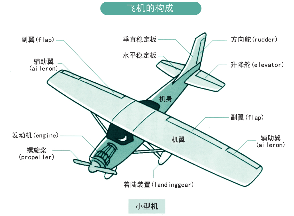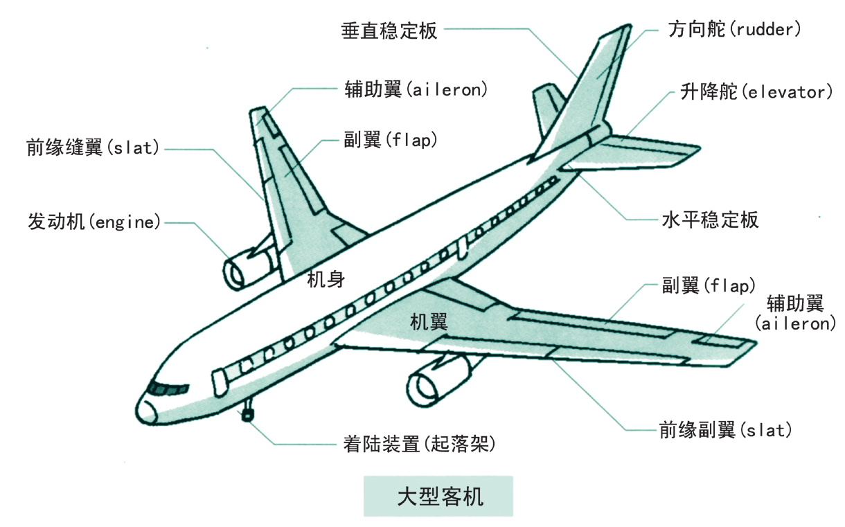 飞机是由机身、机翼、尾翼、起落装置、发动机这五大部分组成的。机身起着搭载驾驶员和乘客、载物、组合其他部分的作用。机身需要精细设计,在获得舒服的室内环境、足够的搭载量的同时,飞行中的空气阻力要尽可能小。