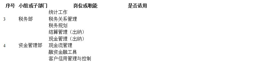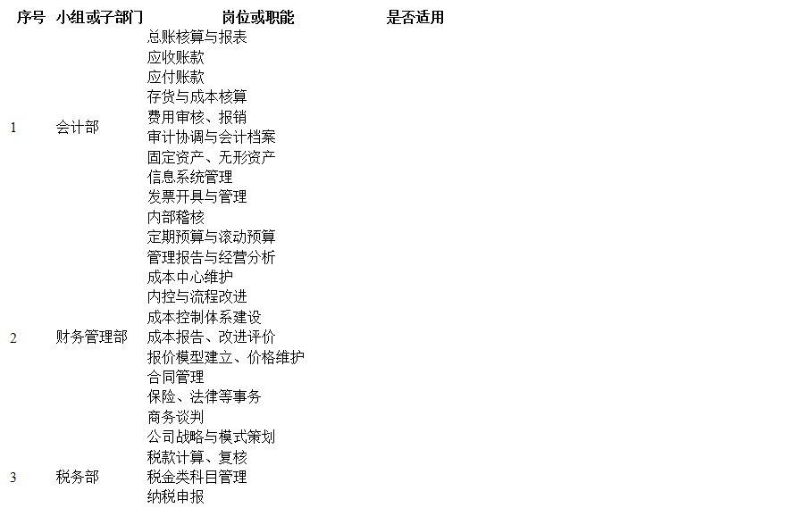 财务部门的工作职能,可以分为四大子部门或工作小组,即会计部、财务管理部、税务部、资金管理部,每个部门都有不同的岗位与职能,如表2-5所示。企业可根据自己的实际情况,在表2-5中进行选择,对适合企业的打钩。然后根据打钩的职能进行项目合并,工作量不大、不涉及岗位牵制的可以合并成一个岗位,如图2-5所示。