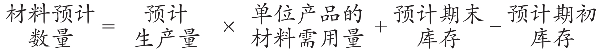 直接材料预算以生产预算为基础编制,显示预算期内直接材料数量和金额。直接材料预算要根据生产需要量与预计采购量以及预计原材料库存进行编制,而预计采购量和预计原材料库存的情况要根据企业的生产组织特点、材料采购的方法和渠道进行统一的计划,目的是保证生产均衡、有序地进行,避免直接材料库存不足或过多,影响资金运用效率和生产效率。材料预计数量的计算公式如下: