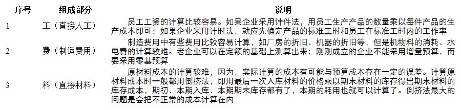 一般来讲,产品的成本由料、工、费三部分组成。料指原材料,工指员工工资,费指制造费用。在编制生产成本预算时,这三项内容各不相同,具体如表3-5所示。