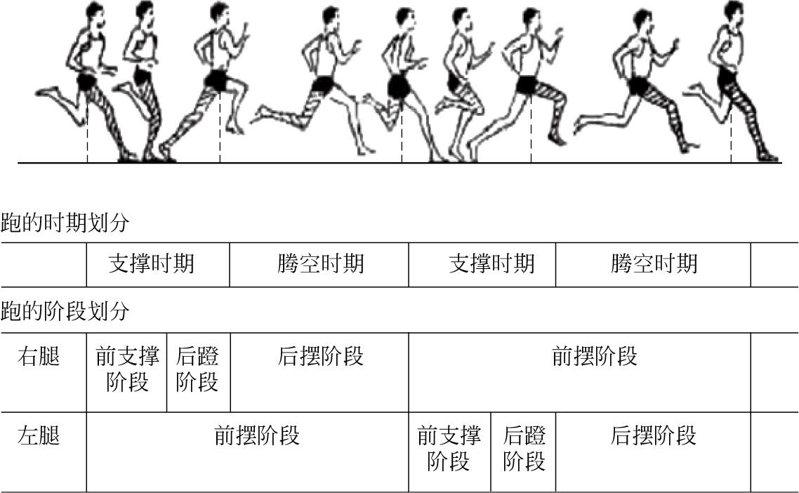 跑步的一个周期是由一个复步(即跑两步)构成的,它经过两个支撑时期和两个腾空时期(图2-1)。