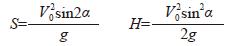 按物体的斜抛原理,某物体以一定的角度抛向空中且抛射点和落点在同一水平面时,其腾空高度 H 为腾起初速度平方和腾起角正弦平方之积,与两倍重力加速度之比;其腾空远度 S 为腾起初速度平方和两倍腾起角正弦之积,与重力加速度之比,用公式表示,分别是