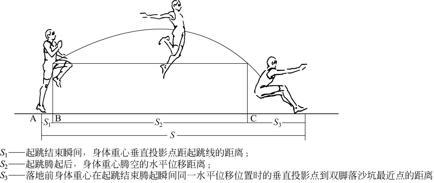 从图2-5所示可以看出,身体重心的腾空远度 S 2 在跳远成绩中占有很大比重。因而,不断提高身体重心的腾空远度,是提高跳远成绩的主要方向。有关研究资料指出,跳远腾空远度 S 2 约占跳远成绩的86%,其他两个远度( S 1 和 S 3 )约占成绩的14%。三级跳远与跳远很相似,身体重心在三跳中的腾空远度是组成运动成绩的主要部分。
