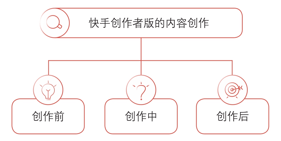 所以,快手决定大力扶持内容创作者,降低创作者的创作门槛,提高创作效率。为了实现这一目标,快手推出了一站式成长工具“快手创作者版APP”。从内容方向上看,从创作前、创作中、创作后三个方面切入全流程创作,如图1-16所示。