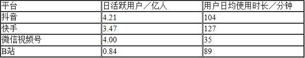 从表1-2可以看出,抖音、快手和微信视频号已经形成了三足鼎立之势。抖音和快手分别以546.0亿元和251.5亿元位列短视频行业第一梯队,其中抖音日活跃用户高达4.21亿人,快手达3.47亿人,用户日均使用时长分别为104分钟、127分钟。微信视频号日均活跃用户近4亿人,日均使用时长35分钟,与抖音、快手形成了用户竞争。