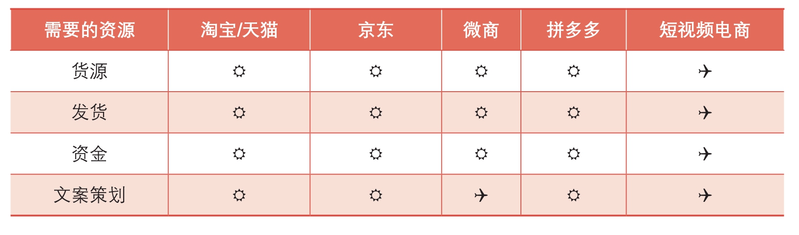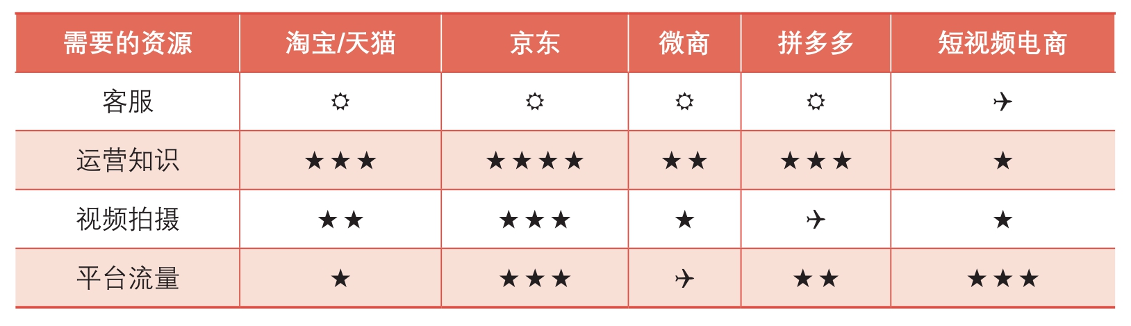 毫不夸张地说,短视频电商是目前为止进军电商领域门槛最低的。对淘宝/天猫、京东、微商、拼多多、短视频电商这5类电商需要的资源进行对比分析,具体如表1-1所列。