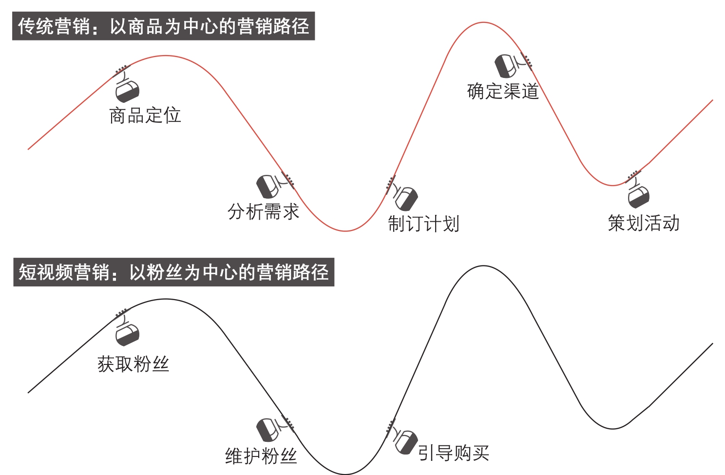 传统营销与短视频营销区别在于营销思维的不同,思维则决定思路。传统营销与短视频营销路径对比图如图1-3所示。