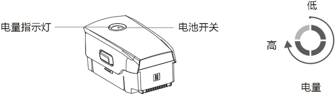 无人机电池上面有一个开关按钮,按一下开关按钮,会显示一个电量指示灯,电量指示灯由4格电量表示,从低到高显示电量,如图1-17所示。