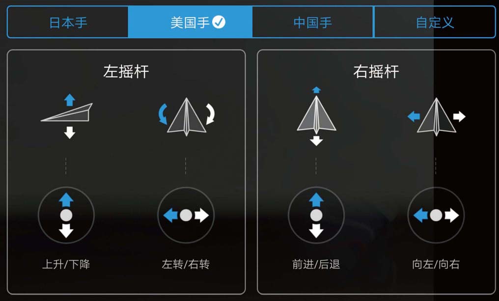 摇杆的操控方式有两种,用无人机航拍圈内的话说,就是“美国手”与“日本手”。