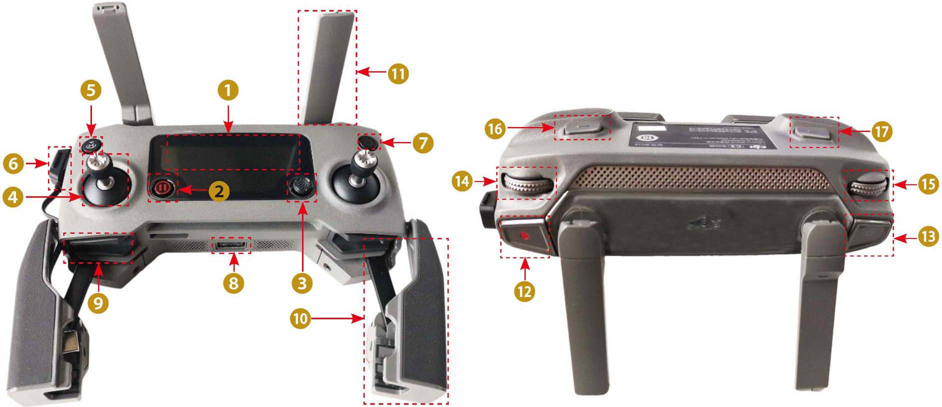接下来,把遥控器底端的手柄打开,这个位置是放置手机的位置。下面介绍遥控器上的各功能按钮,如图1-9所示。