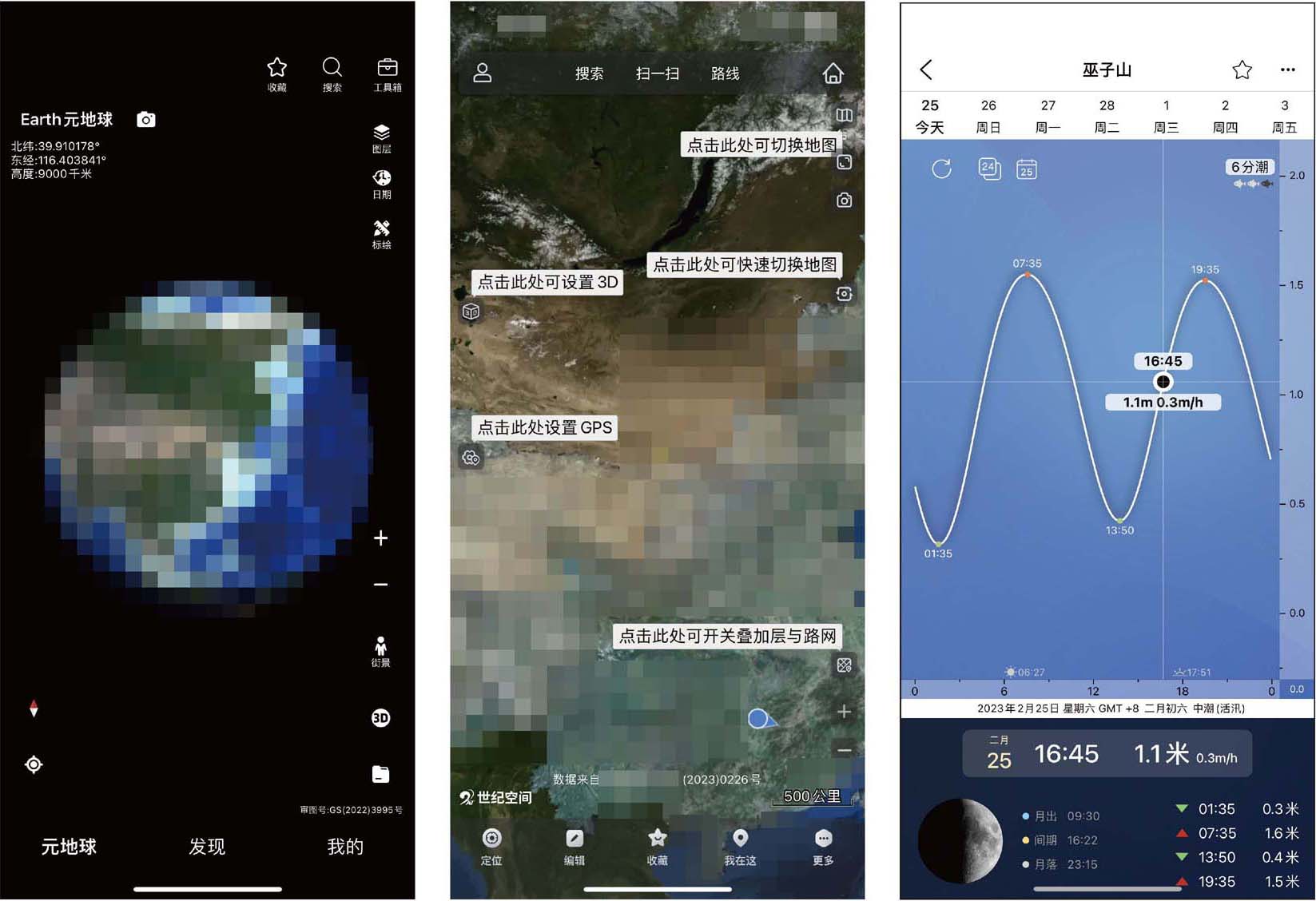 图3-10 Earth-元地球、奥维互动地图和全球潮汐App