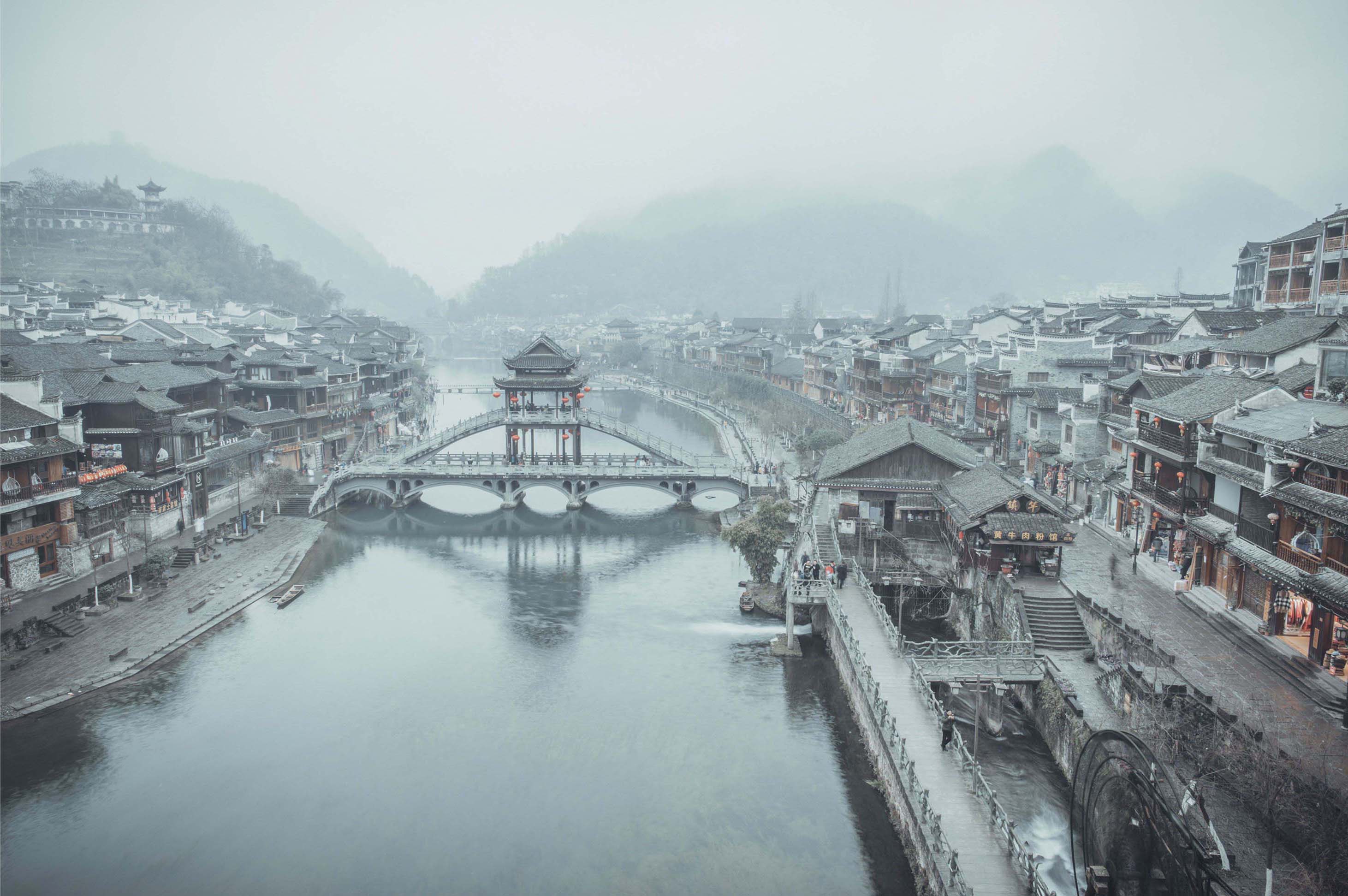 用户可以让无人机沿水面飞行,拍摄出绝美的风光建筑倒影效果;用户也可以在高空俯拍水面周围的环境,进行整体展示。图3-3所示为无人机航拍的沱江周围的凤凰古镇,云雾缭绕,如同一幅古风古韵的水墨画。