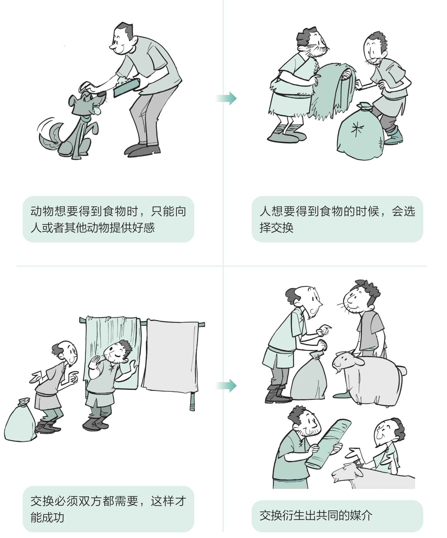 “举个例子吧,生产粮食的农民不能生产皮毛和建筑材料,那么他就不能取暖,不能住上大房子,只有粮食不足以维持生存,或是说不能很好地生活。但是,从仅仅供给食物而言,他的粮食是他吃不完的。同样的道理,生产皮毛和建筑材料的人可以造出很多保暖用品,可以盖很多房子,但是没有吃的,这就需要交换。”