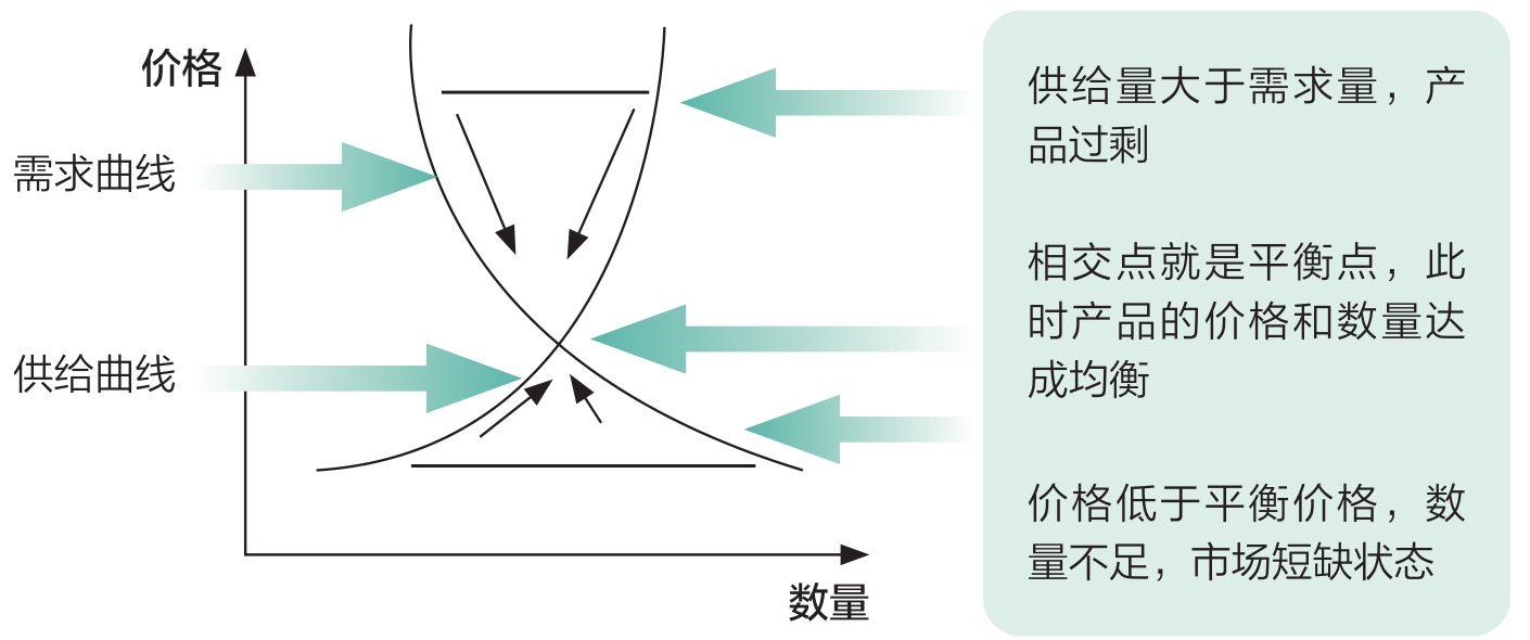 “最普遍的看法是,操纵市场的力量就是客观的经济规律。在市场经济体制中,每一个消费者都依据效用最大化的原则做购买的决策,而生产者依据利润最大化的原则做销售决策。两者的关系就形成了供求关系,市场就会受到供求关系的影响,通过价格的变动,引导资源向着最有效率的方面配置。这时的市场就在价格机制、供求机制和竞争机制的相互作用下,推动着生产者和消费者做出各自的决策。市场活动中,每一个人既是消费者,又是生产者,其实都是指‘经济人’。经济人从道德上和经济角度选择的‘为己利他’手段——等价交换。通过有规律的等价交换,市场经济就创造了社会财富,促进了社会发展,也增加了每个人的利益。”