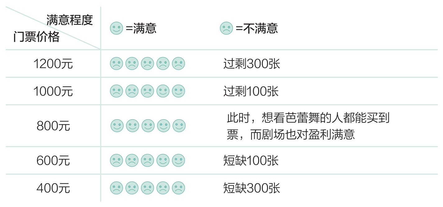 以芭蕾舞门票为例。在自由市场中,一张票的价格是800元。当高于或者低于800元的时候,就会引起消费者(观众)或者生产者(剧团、演员)的不满。在“看不见的手”的操纵下,最后双方都勉强满意,价格被推回到800元左右。