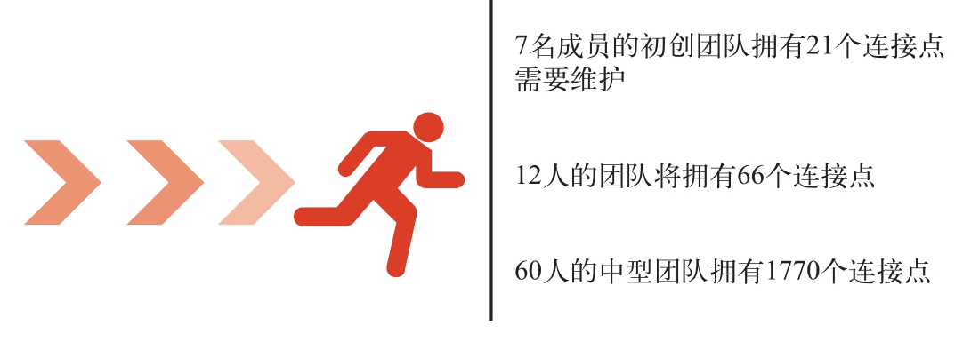 连接点的急剧增加引发管理失误的可能性增加,此外成员相互误解与信息错误传达的可能性也相应增加。要让团队中每位成员都对工作内容知情、协调并整合所有人的工作进度需要投入大量的时间与精力,其中还可能产生滚雪球效应,信息在传达过程中被层层延迟。