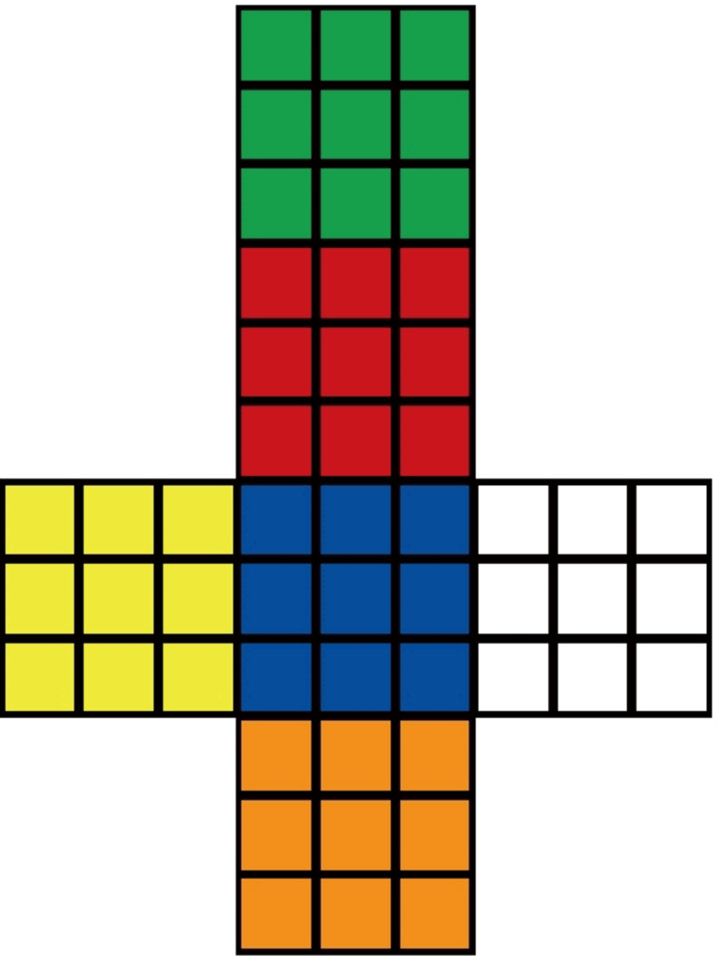 从外观上看,三阶魔方一共由6个面组成,初始(还原)状态下每个面一种颜色,通常是白、黄、红、橙、蓝、绿这6种颜色。每个面都是由9个色块组成的“九宫格”。