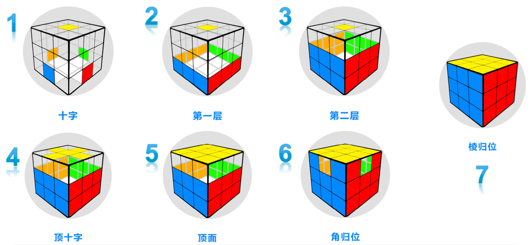 前面介绍过魔方转动的时候是以“层”为单位来实现的,因此还原魔方的过程也是“一层一层”来完成的。如果做个比喻的话,还原魔方的过程十分像是在“盖房子”。三阶魔方一共三层,所以还原魔方可以看作我们要盖一个三层楼的房子。图1.12是还原魔方的7个步骤,我们看一看是怎样盖成这个“房子”的。