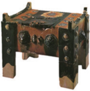 隋唐五代时期,家具的造型还受到了建筑技术发展的影响。垂足而坐与席地而坐的方式并存,相应地,出现了高低家具并存的局面,圈形扶手椅、长桌凳、圆鼓凳、靠背椅、顶帐屏床等新形式的家具制作日趋合理,尺度与人体比例相协调,有些部位施以曲线图案雕饰。两宋时期,垂足而坐的方式全面普及,床柜、桌椅、大案等高型家具已普遍流行。受建筑结构的影响,梁柱式框架结构的家具流行,桌面和腿部的交接处开始运用牙头装饰,束腰、马蹄脚形制均有出现,还较多使用装饰线。唐代钱柜如图1-3所示。辽代木盆架(其中一条腿已经损坏)如图1-4所示。