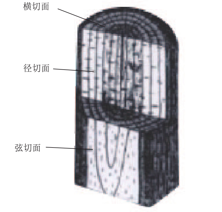 由于木材的构造在不同方向上表现出不同特征,通常可从木材的三个切面,观察木材的主要特征及内在联系。木材的三切面如图1-12所示。