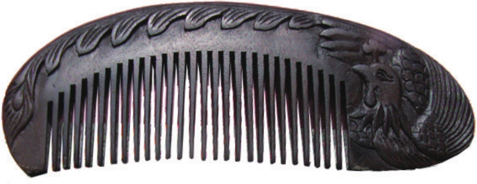 乌木又称“巫木”,并非指某一特定树种,而是黑色木材的总称。我国云南、海南等地区也有出产。明末方以智《通雅》注曰:“木生水中黑而光,其坚若铁。”可见乌木可分数种,木质也不尽相同,有沉水与不沉水之别。乌木的特点是坚实如铁,光亮如漆,略似紫檀,老者纯黑色。但因乌木性脆,又少有大料,故在红木家具中,乌木类家具相对较少,或与其他木种结合使用。乌木梳子如图1-21所示。