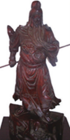 紫檀木的特征主要表现为颜色呈犀牛角色泽,它的年轮纹大多是绞丝状的,尽管也有直丝的地方,但细看总有绞丝纹。紫檀棕眼细密,木质坚重。以紫檀木制作的家具或摆件,表现出稳重大方、沉实厚重的“气质”。紫檀木切面纹理如图1-8所示。紫檀木关公像如图1-9所示。