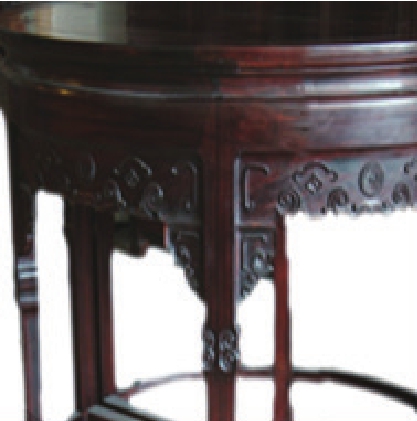 在广义的红木类家具中,酸枝木类数量最多。以酸枝木制作的家具,具有古朴典雅、端庄稳重的气势。黑酸枝半圆桌如图1-13所示。