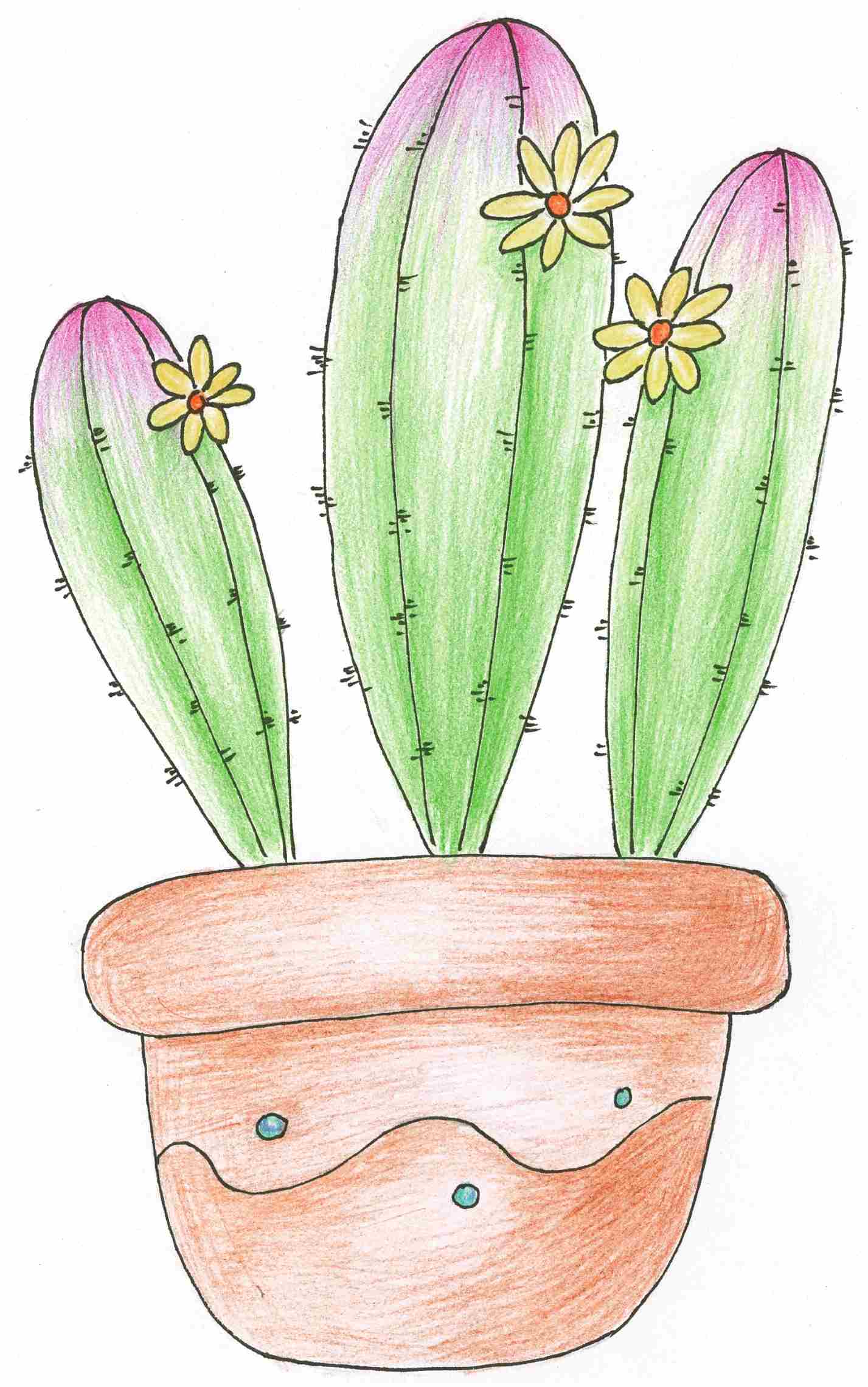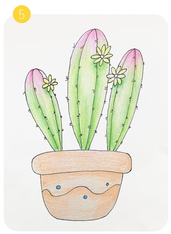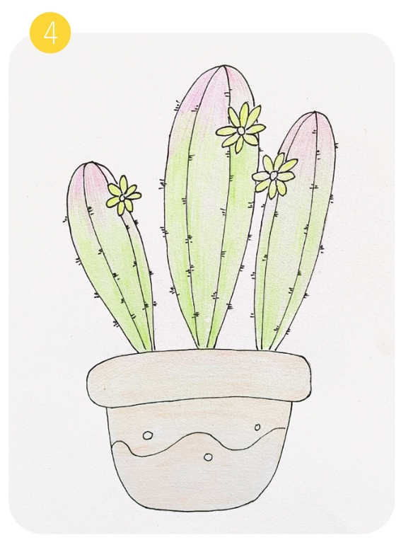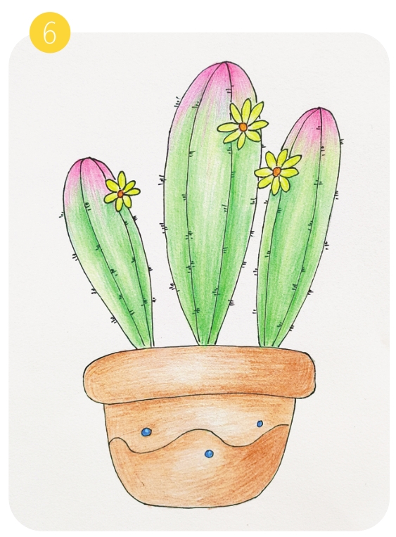 用色铅笔上色。用赭石平涂花盆,用玫红和黄绿以双色渐变的方式涂出仙人掌的渐变色,注意用笔的力度。