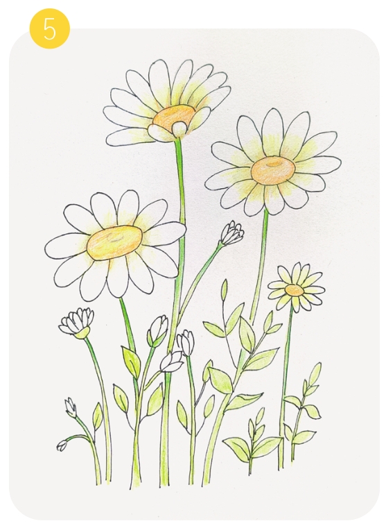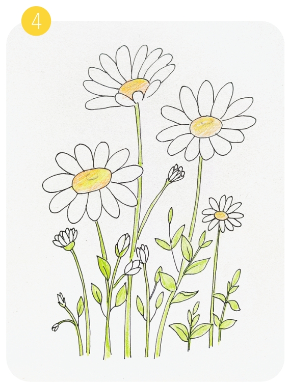 用色铅笔上色。用中黄平涂花心,用黄绿平涂枝干和叶子,注意用笔的力度。