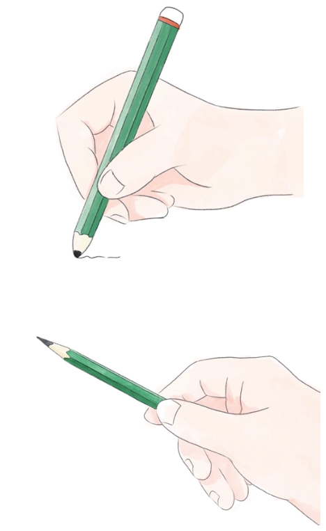 1.竖握笔: 握笔位置离笔尖较近,从而让笔立起来。这种握笔方式能清晰地展现笔触,勾画出锐度很高的线条,也可以用于小面积加重颜色。